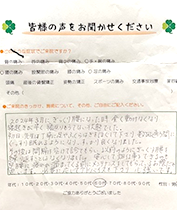 ギックリ首やギックリ腰にすぐに対応してくださり、針やツボを押さえての治療が効果的面です。(40代 女性)