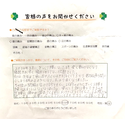その後は間隔をあけて診てもらい、以前のようにぎっくり腰を繰り返すことがなくなりました。安心して畑仕事をできるのも足腰に疲れが溜まってくる前にメンテナンスしてもらっているお陰だと思います。必要に応じてアドバイスを下さり心強いです。