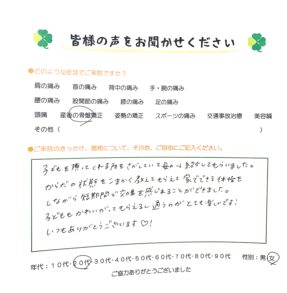 でも、もう大丈夫。あなたと同じ産後の不調に悩んでいた人が当院の施術で改善されております。