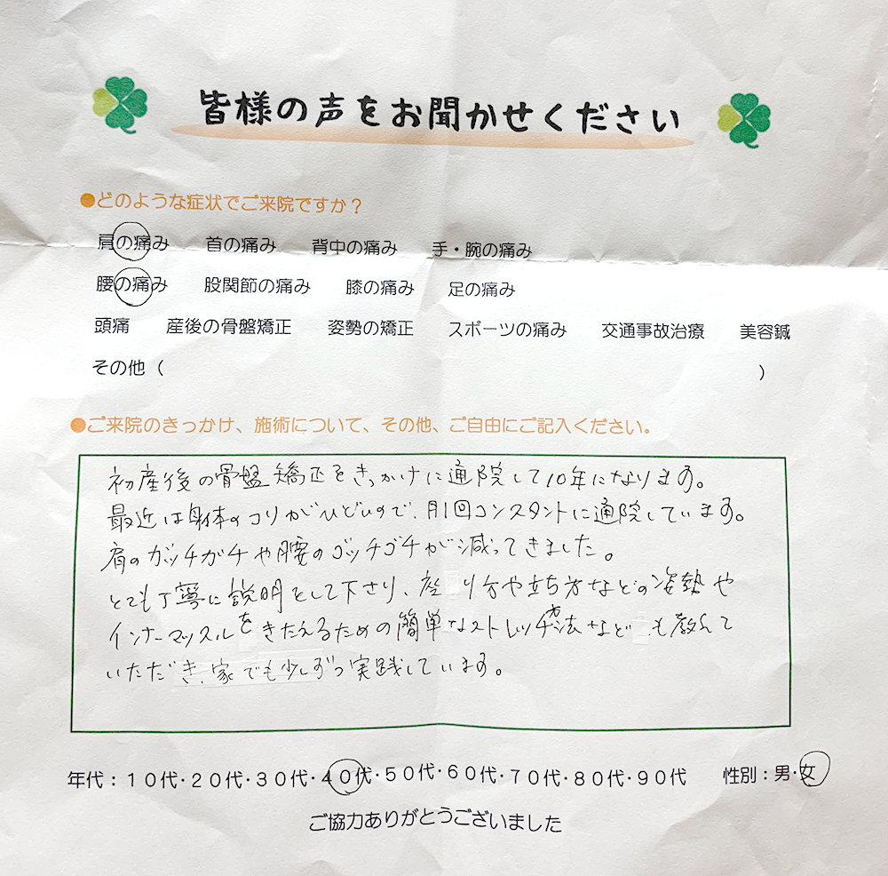 初産後の 骨盤矯正をきっかけに通院した10年になります。