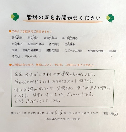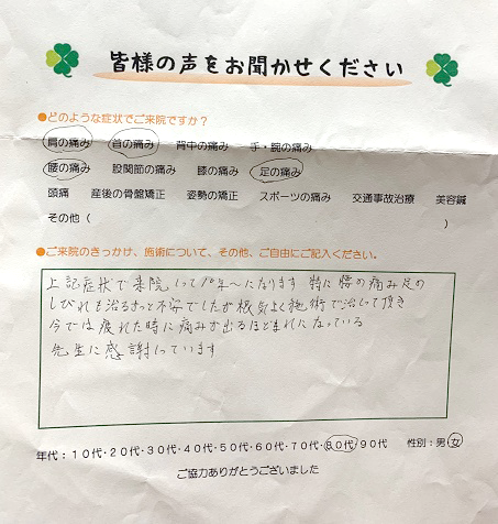 肩の痛み、首の痛み、腰の痛み、足の痛みで来院して、10年〜になります。特に腰の痛み、足のしびれも治るかと不安でしたが、根気よく施術で治して頂き、今では疲れた時に痛みが出るほど稀になっている。先生に感謝しています。